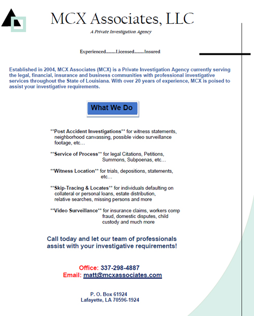 Service of Process, witness location, fraud investigations on workers comp claims, surveillance, criminal background checks, and much more.